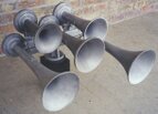 1 | Nathan P5 ![]() | P5 is shorthand for the designation P12345. The picture illustrates a common arrangement of the horn bells, with the #2 and #4 bells reversed. In this configuration, the horn is designated a P135R24. The lengths of the bells decrease as their number increases. In the photo, the #1 bell is at lower right, #2 at lower left, #3 at center, #4 at upper right, and #5 at upper left. This horn also utilizes the older style manifold. The newer manifold, introduced when the P5 was retuned to create the P5a for Amtrak, can be seen on the P5a page. Factory tuning was: A major dominant 7th (C#,E,G,A,C#). Old casting P5's are rarely found in regular service today. Newer, dischordant P-5's are commonly found on older Norfolk Southern locomotives and on Illinois Central. NS began specifying the K-5LA for its new locomotives in the late 1980's, and with the purchase of IC by Canadian National, it is unlikely that IC will acquire additional P5's. Airhorn from Southern Railway, various locomotives: Sample1 | |