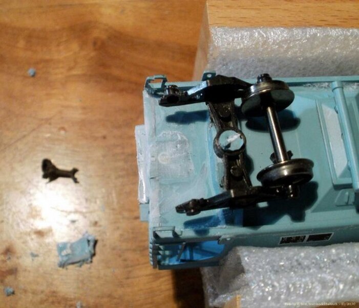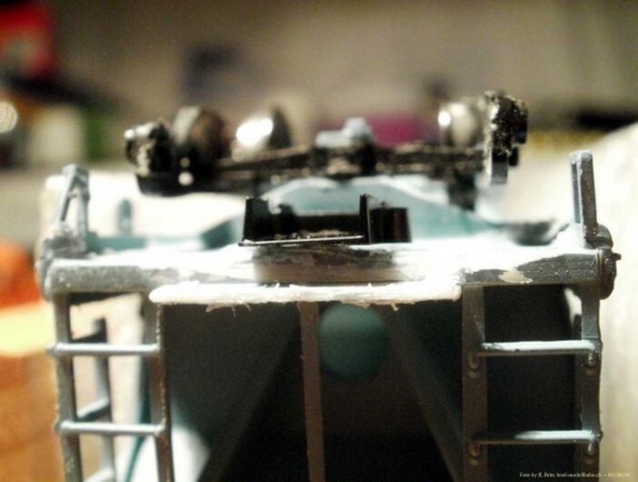 Eine Kadee #5 wurde in den Kupplungsschacht mit Sekundenkleber Bombenfest eingeklebt. Diese Kupplung war dadurch starr und unbeweglich (Schwenken: Links-Rechts). Deshalb musste dieser Wagen gezwungener massen als Schlusswagen herhalten. Bilder von dem entfernen der alten Kadee #5 und des Schachtes. So wie Montage des neuen Schachtes und Kadee #5.