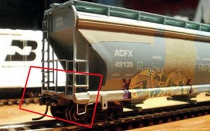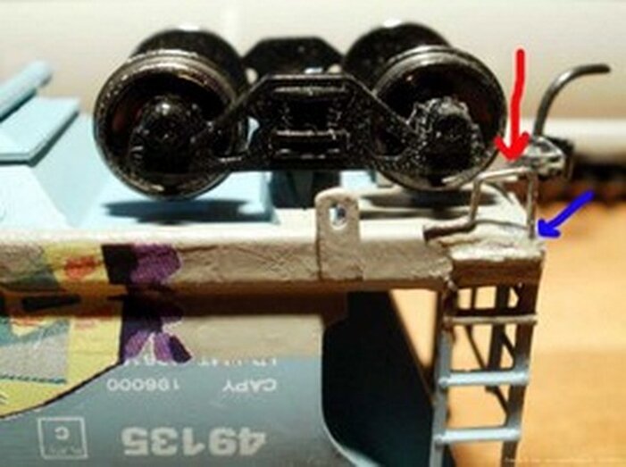 Reparierten Front oder Heck Schaden. Der Sichbare Teil der Schraube, welche den Schachtdeckel und die Kadee #158 halten. Wird noch verdeckt durch ein Anbauteil oder Luftkessel (Blaues Quadrat).
