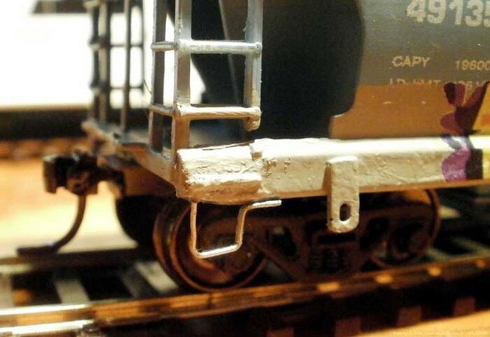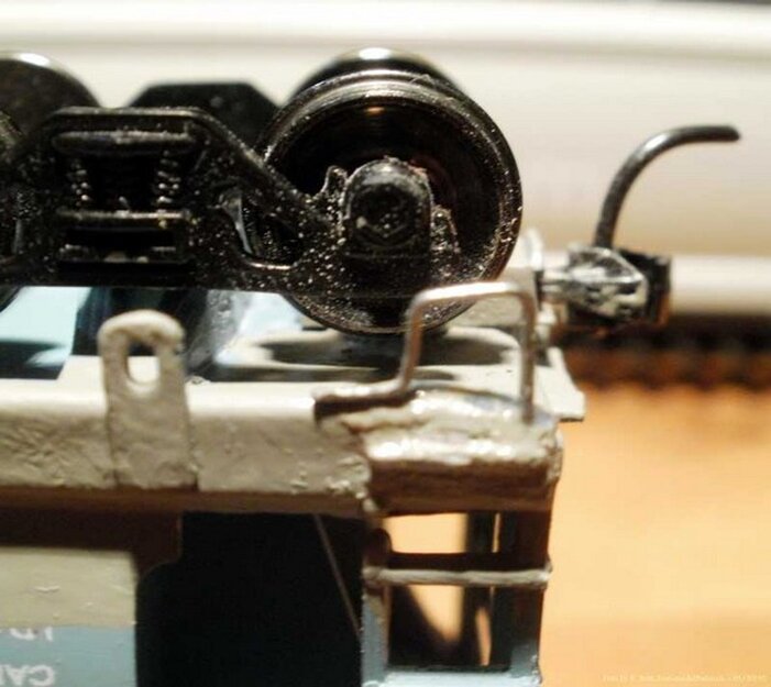 Eine Kadee #5 wurde in den Kupplungsschacht mit Sekundenkleber Bombenfest eingeklebt dies machte sich durch weisse Verfärbung bemerkbar. Eine Wagen Seite hat ebenfalls solche Spuren. Darum sieht man HIER nur eine Seite.