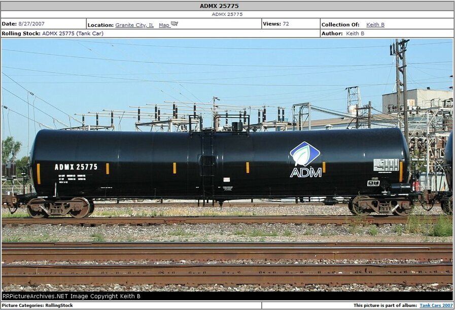 Owner: ADM Transportation CompanyType: Tank Car Max Gross Weight: 263000AAR Type: T107 Load Limit: 187000AAR Class: T Liquid Capacity: 25808Plan: CDetail Info: Tank Cars, General Service Cars, Carbon Steel Tank (Welded or Riveted), Includes Rubber Lined.