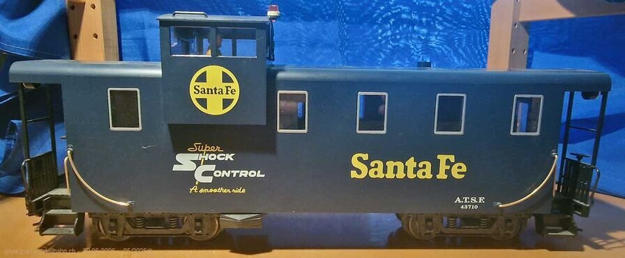 Gebraucht gekauft beim Gartenbahn Fahrtag in Stallikon ZH. Dies eine Caboose "Santa Fe" - "Super Shock Control" der Queen Mary Series [Art.-Nr. 43710 LGB]. Mit bereits montierten Kadee's. Hat Innen- und Aussenbeleuchtung. Welche nicht Funktioniert. Werde mal sehen. Anwas es liegt und ob ich sie Funktionstüchtig hin bringe...