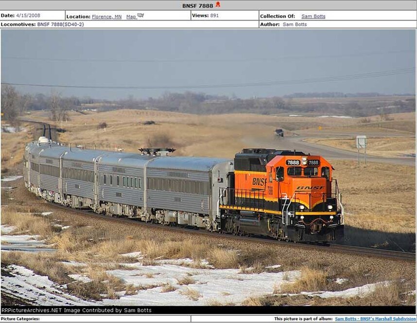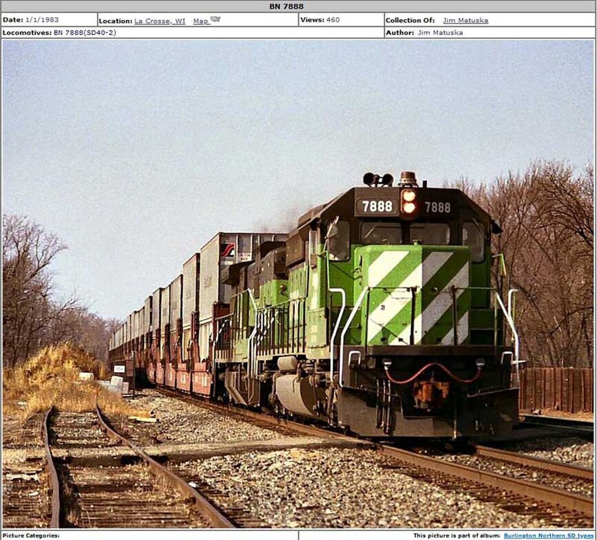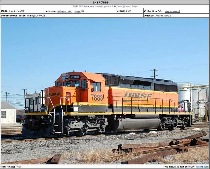 Serial Number: 786173-55 Built As:CS 7888 (SD40-2)Frame Number:786173-55 Order No:786173Notes:Ex-C&S Built:6/1979Other locos with this serial: ③ BN 7888(SD40-2) ② BNSF 7888(SD40-2) ① BNSF 1593(SD40-2)①②③ BILDJede menge Bilder von der #7888 BNSF sind da zusehen!