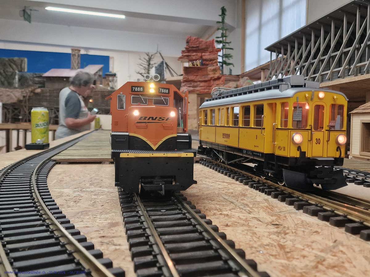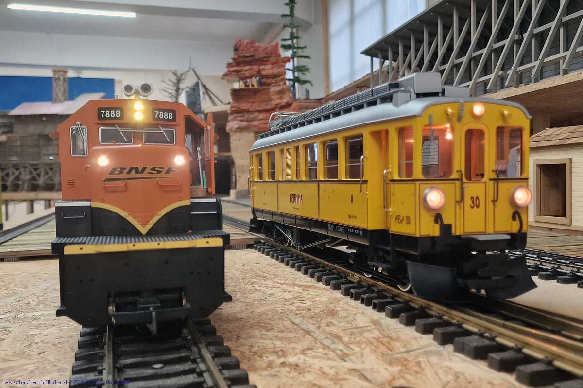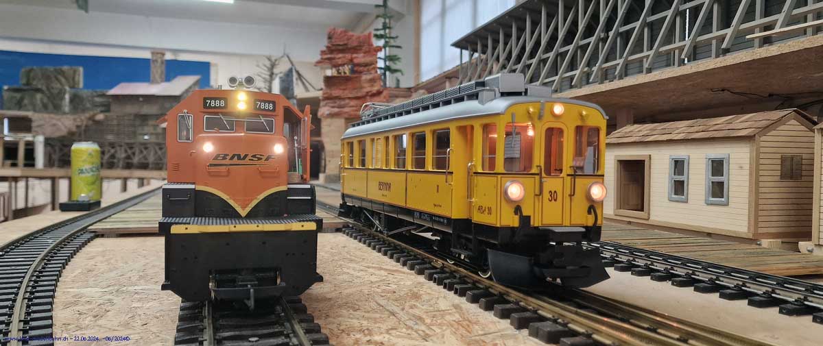 22.06.2024 | BNSF Division | Gartenbahn Indoor Fahren -- SD40-2 & ABe 4/4 - Version 2Gartenbahn Spur G (1:29 & 1:22,5) Fahren. Dies auf der Indoor Anlage von den US G-Scale Friends Switzerland (https://us-g-scale.ch/).Da habe ich meine SD40-2 von USA Trains mit Umbau auf ZIMO MX699LSE Sounddecoder ausgibig in Ruhe Testen und Fahren lassen können. Sie kann Radien von R3 ohne Probleme befahren. Alles was darunter ist. Hat sie mühe und Probleme. An der SD40-2 werden noch die beiliegenden Parts montiert. Sowie sie auf Kadee Kupplungen umgerüstet wird. Ebenso hat André Wetli seine ABe 4/4 von LGB aus gibig fahren lassen. INT: 2024 06 23 SD40 2 & ABe44