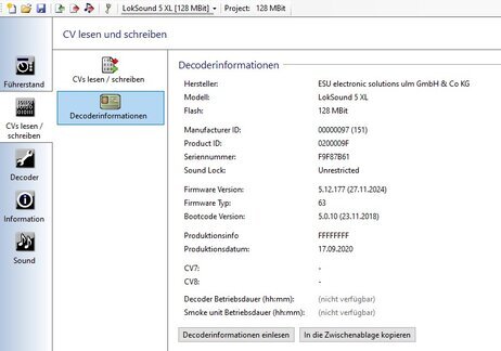 Funktionen (F) Meine Einstellung von Projekt mv F0 Licht [1] F1 Numberboards und Klassifikation light front green and Reward red F2 Cab light F3 Hand Brake Ratchet [14] F4 Bell (Soundslot 4) [4] F5 Rauch Automatisch aus nach 3 Min. (Nachtanken -> Einschalten) F6 Airt Valve [17] F7 Airhorn short (Soundslot 3 )[3] F8 Motor Sound EMD 16-645E Reverser [19] Starting Delay [26] DD7 Tracktions Motor [25] F9 Drive Hold F10 Sound Fader F11 Cab Chatter (Soundslot 21) [21] F12 Kupplung [5] F13 Sanding Valve [13] F14 Alarm Bell [22] F15 Cab Door [15] F16 Engine Compartment Doors [16] F17 Slow Splitter Valve [17] F18 Splitter on Shutdown [18] F19 Reverser [19] F20 Reverser Center [20] F21 Cab Chatter (Soundslot 21) [21] F22 Alarm Bell [22] F23 Flange Squel [23] F24 Short Air Let Off [24] F25 DD7 Tracktions Motor [25] F26 Starting Delay [26] F27 Manuel Notching Logic [27] F28 SD40-2 Smart Start beep 1 [28] F29 Brake Set/Release Automatic [29] F30 Alerter [30] F31 Soundslot 31 [31] F32 x Habe automatisches Feststellbremse aktiviert | Decoderinformationen Hersteller ESU electronic solutions ulm GmbH & Co KG Modell LokSound 5 XL Flash 128 MBit Manufacturer ID 00000097 (151) Product ID 0200009F Seriennummer F9F87B61 Sound Lock Unrestricted Firmware Version 5.12.177 (27.11.2024) Firmware Typ 63 Bootcode Version 5.0.10 (23.11.2018) Productionsinfo FFFFFFF Productionsdatum 17.09.2020 CV 7 - CV 8 - Decoder Betreibsdauer (hh:mm) (nicht verfügbar) Smoke unit Betriebsdauer (hh:mm) (nicht verfügbar) |