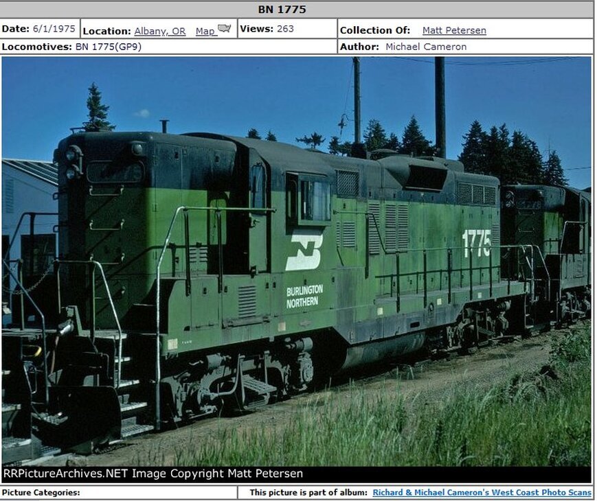 Owner: Great NorthernModel: EMD GP9 Built As: GN 703 (GP9)Serial Number: 20845 Order No: 5412Frame Number: 5412-3 Built: 12/1955Notes: To BN no. 1775, then to GMSR 02/16/1987Other locos with this serial: ③ MSRC 9006(GP9) ② BN 1775(GP9) ① GN 702(GP9)① BILD② BILD