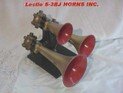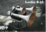 Factory tuning: A major triad (C#, E, A). The horn used Supertyfon bells #277, 330, and 440. The numbers refer to the bells' resonant frequencies in hertz. In later Leslie production, bell numbers were truncated to just the first two digits. Though produced for less than a year, the S-3J found application on several railroads. The L&N, Illinois Central, Frisco, Rutland, and the Vermont Railway are believed to have purchased the horn before production ceased. None are known to still be in use today. Airhorn from S-3J sound samples (courtesy Brent Lee): Sample1 | |