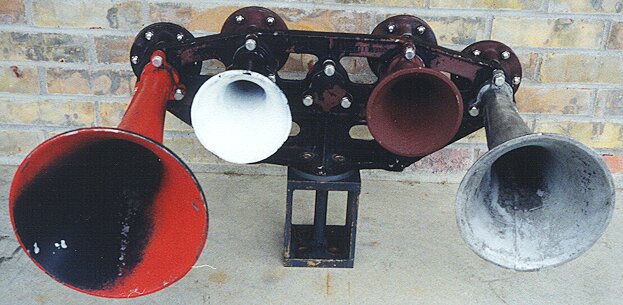 Prefixes: R=improved horn bells with spiked back caps Suffixes: O=some bells have swapped locations on manifold relative to the standard arrangement F=full openings in orifice dowel pins R=one bell reversed (turned backward) RR=two bells reversed The horn pictured is an S-5T-RRO, with the #31 and 55 bells reversed. Left to right, the bells are #37, 55, 25, 44, and 31. The standard arrangement (i.e. an S-5T-R) would have the bells in exactly the opposite order. Another common arrangement has the #44 and #55 bells reversed. For the sake of simplicity, a horn with reversed bells is generally referred to as an S-5T-R. Prime Manufacturing Corp. of Oak Creek, WI offered a horn identical to the S-5T, which they called the PM-929. No PM-929's are known to have been produced, however. Factory tuning was: B major 9th (B,D#,F#,A,C#). No large railroads have purchased the S-5T in recent years, but examples can still be found on older Illinois Central, CSX, KCS, and a handful of Burlington Northern locomotives. Norfolk Southern may have a few S-5T's left on former Norfolk & Western units. Union Pacific's E-units #949 and 951 had RS-5T's as of mid-2000. Airhorn from Norfolk & Western, various locomotives: Sample1 | |
