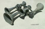 14 | Leslie S-5D | The S-5D was Leslie's first five-chime Supertyfon airhorn. Produced only in 1952, it played the same notes as the Nathan M5. Two different manifold designs were used on the S-5D. The one shown in the photo is the later version, with diagonal and horizontal bracing around the two highest bells (the 554 and 440). Earlier S-5D manifolds lacked these extra pieces, with the bells mounted precariously on "stalks" similar to the high profile J-base used on the S-3J. Only a few S-5D's were produced before Leslie introduced its replacement, the S-5T, in 1953. Factory tuning was: A major dominant 7th (C#,E,G,A,C#). The horn used Supertyfon bells #277, 330, 392, 440, and 554. The numbers refer to the bells' resonant frequencies in hertz. In later Leslie production, bell numbers were truncated to just the first two digits. A few S-5D's survive today in private collections. Airhorn: Sample1 | |