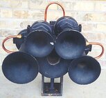 03 | Nathan H5 | The H5 was the world's first five chime air horn. Developed by Robert Swanson (founder of AirChime) in 1949, only 88 H5's were made before the design was refined into the M5. The "H" stood for "hexatone," a carryover from Swanson's original multichime airhorn, the six-chime H6. The bells of the H5 were welded together into a single unit, and could not be reversed as on the M5. The M5's bells and power chambers were bolted to a manifold, but in the H5, pressurized air was supplied to the bells through individual tubes emanating from the base. This example appears to have been replumbed with rubber tubing.Original tuning was: A major dominant 7th (C#,E,G,A,C#), but this could easily be changed to a number of other chords including F# minor 6th (C#,D#,F#,A,C#) and C# diminished (C#,E,G,A#,C#). Airhorn from: Sample1 |