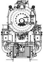 The cylinders of the 3751-class locomotive are combined in a one-piece steel casting representing a saving in weight of approximately 25 per cent over cylinders of cast iron. This steel cylinder casting is bolted and keyed to a locomotive bed and cradle frame cast of steel in one piece, with separate steel front deck casting in order to facilitate repairs in case of accidental collision. The steam and exhaust passages of the cylinders are designed free from restrictions and obstructions to the flow of steam. The exhaust passages are gradually reduced in area from the valve bushings to the base of the exhaust pipe in such a way that the cross section at no point is larger than a preceding section. All fillets have at least ' in. radius.