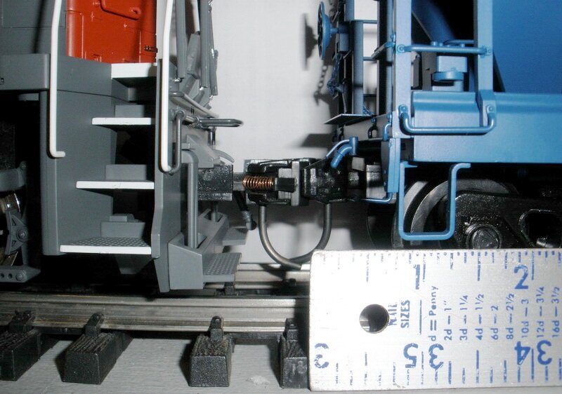Momentan hat sie "Knuckle Coupler" montiert. Diese werden jedoch entfernt und es werden Kadee's mit CamPac Componets verbaut. Welche ausgelegt sind auf lange (>60 Cars) und sehr hohes Gewicht-Zuggewicht. Nicht nur in der Ebene, sondern auch in Steigungen und Gefälle.