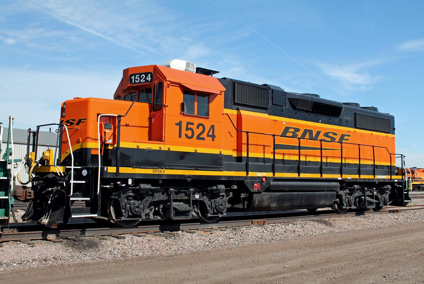 A second-generation Electro-Motive Diesel (EMD) yard-switching engine at Hobson Yard in Lincoln, Nebraska. This is EMD GP28-2 (GP28M) low emissions BNSF H4 1524.GE GEVO ES44AC #5791 BNSF Black swoosh. Modell von Roman Britt - Verwittert von Mel Nipkov. Modell: Intermountain Railway Company DC/DCC w/Tsunamie Sound / Model by Roman Britt - Weathered by Mel Nipkov. Model: Intermountain Railway Company DC/DCC w/Tsunamie Sound