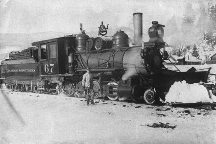 Colorado & Southern-Lokomotive räumt Schnee von den Schienen, ca. 1898-1903 (Park County Local History Digital Archive)Untergang des Schmalspurs