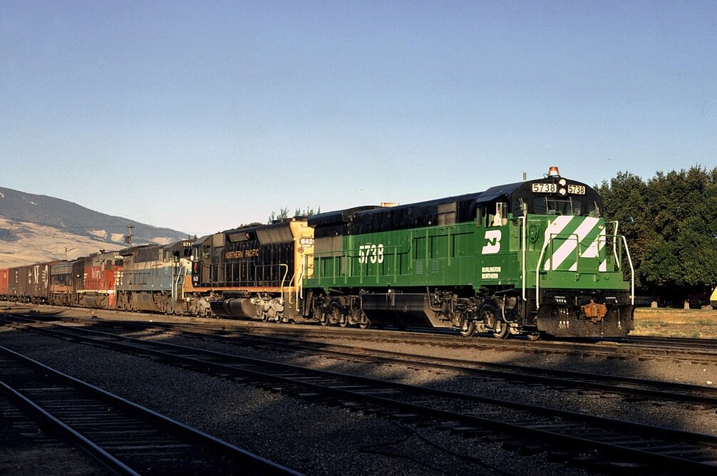 With three of four predecessor railroad locomotives in a five-unit consist, BN 5738, a GE U33C, departs Livingston, Montana in August 1971. | ||