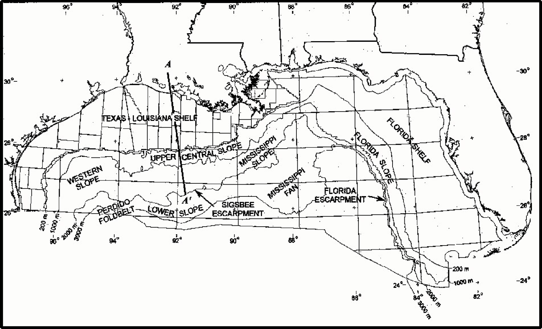 - Gulf of Mexico basin, which contains the Sigsbee Deep and can be further divided into the continental rise, the Sigsbee Abyssal Plain, and the Mississippi Cone.