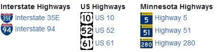 Residents use Interstate 35E running north–south and Interstate 94 running east–west. Trunk highways include U.S. Highway 52, Minnesota State Highway 280, and