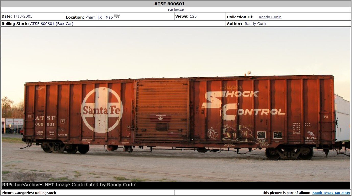 Zeigt eine andere Roadnumber #600601 SF/ATSF, aber den selben Box Car Typ. Da es keine Historie von der Roadnumber #600307 SF/ATSF gibt. AAR Type: A632 Built As: UnbekanntAAR Class: XL New: 5-79Plan: E Built: UnbekanntJede menge Bilder von der #600601 SF sind da zusehen!