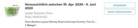 So der Bambus ist endlich nach sehr, sehr langer Reise bei mir eingetroffen. Wo über er in dieser zeit war. Ist nicht mehr nach vollziehbar. Da das Tracking nach Bearbeitung vom chinesischen Zoll am xx.xx.2020 endet und zugleich als zugestellt im Zielland angegeben wird. Ob es jetzt auch wirklich 100 Einzelne Bambuse sind oder mehr oder weniger habe ich nicht geschaut. Ebenso wenig habe ich sie gezählt.