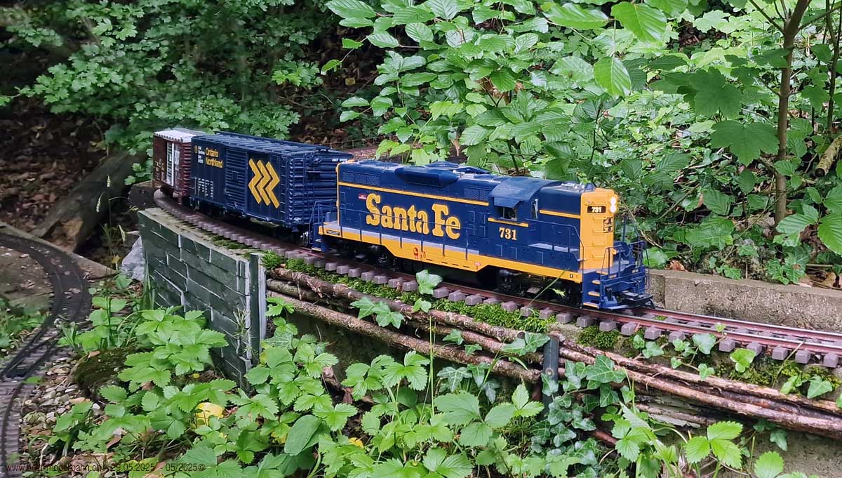 BNSF Division | 04.06.2025 | Gartenbahn Fahrtag in Stallikon ZH, am 29.05.2025Wahr wahrscheinlich der letzte Fahrtag auf dieser Gartenbahn Anlage. Für die Vereinsmitglieder vom US G Scale Friends Switzerland. Da das Grundstück Verkauft wird. Dies Altershalber.Da meine NYC GP38-2 Probleme macht. Seit dem wieder Anschliessen der beiden Rauchgeneratoren. In dem die Headlights das DAUER Blinken haben. Sobald man F0 Aktiviert. Egal ob irgend noch andere Funktionen aktiv sind oder aktiviert werden. Mit Ausnahme der Bell, Airhorn, Headlights, Rauchgenerator und Sound.Der Verkäufer meint. Das es mit Sicherheit. An dem liegt, dass der Decoder Überspannung hat oder bekommt und zu dem zu viel Ampere bekommt. Da alleine schon die beiden E-Motoren schon je etwa 3 Ampere verlangen und die beiden Rauchgenerator auch etwa je 1 Ampere verlangen...Er wird sie Umbauen und entsprechende Relais zusätzlich verbauen und vielleicht gleich den Decoder neu Programmieren...Im Moment ist sie beim Verkäufer für den Umbau. Wann sie wieder zurück ist... Wer weiss...INT: 2025-05-29 Gartenbahn Fahrtag in Stallikon ZH V8 Master .