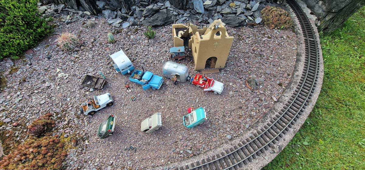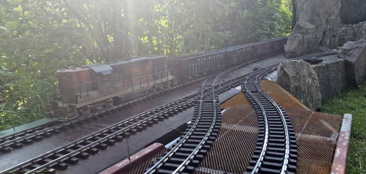 Hugo und Ruth sehr gut gefahren. Allerdings darf sie nicht länger sein als eine SD45. Das ist das Mass der Länge. Ebenso gehen da keine 60' Box Cars und 55' Modern Tank Cars. Die sind alle viel zu lange. So das sie spätestens an einem der beiden Tunnels hängen bleiben.Ebenso ist auch meine LGB SF Caboose etwa 3 cm zu hoch. so das man mit ihr durch keinen Tunnel auf dieser Anlage fahren kann.