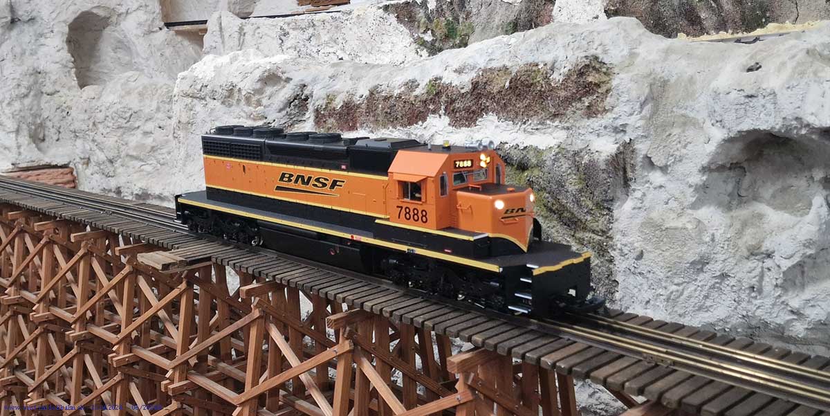 22.06.2024 | BNSF Division | Gartenbahn Indoor Fahren -- SD40-2 & ABe 4/4 - Version 2Gartenbahn Spur G (1:29 & 1:22,5) Fahren. Dies auf der Indoor Anlage von den US G-Scale Friends Switzerland (https://us-g-scale.ch/).Da habe ich meine SD40-2 von USA Trains mit Umbau auf ZIMO MX699LSE Sounddecoder ausgibig in Ruhe Testen und Fahren lassen können. Sie kann Radien von R3 ohne Probleme befahren. Alles was darunter ist. Hat sie mühe und Probleme. An der SD40-2 werden noch die beiliegenden Parts montiert. Sowie sie auf Kadee Kupplungen umgerüstet wird. Ebenso hat André Wetli seine ABe 4/4 von LGB aus gibig fahren lassen. INT: 2024 06 23 SD40 2 & ABe44