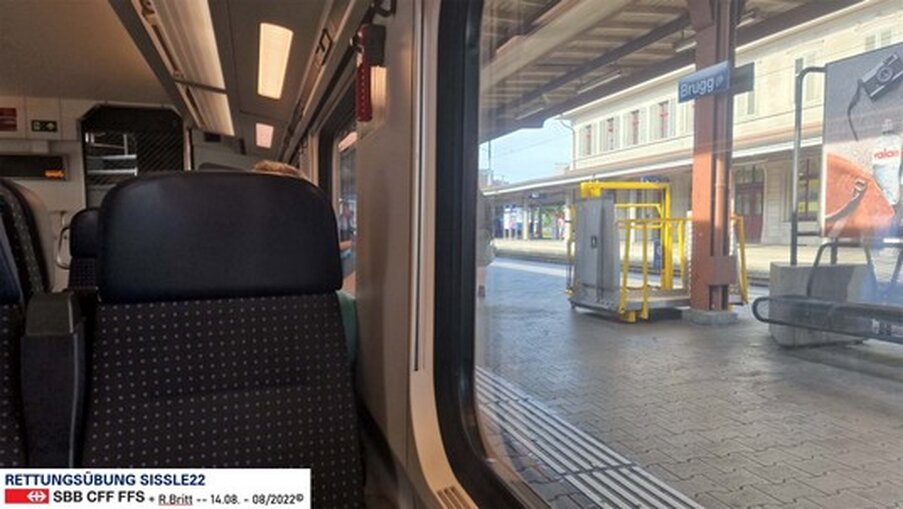 Nach dem Checking (08:15) wurden alle 800 Figuranten und 200 Normale Personen umfassend Informiert und es wurde erklärt um was es geht und wie die Übung abläuft. Ebenso wurden die Beteiligten Organisationen genannt. Einige Personen davon wurde nur Mitgeteilt das es eine Übung gibt. Aber wann und was für eine wurde, nicht mitgeteilt. Damit die Übung so realistisch wie möglich ist. Danach begab man sich gemeinsam an den Bahnhof Brugg auf das Perron 2-3 Wo dann der Übungszug eintraf. Danach musste man in die jeweilige gekennzeichneten Doppelstockwagen einsteigen. Um 11:00 fuhr dann der Zug los vor das Portal des Bözberg Tunnels. Da wurden dann ein paar Rangier Manöver gemacht. Nach weiteren 20 min. warten fuhr wir dann in die Mitte des Tunnels und da kam dann die Durchsage. Das man auf Platz bleiben muss. Da sie Ausserhalb des Zuges die Schadenplätze, Feuerwannen und Nebelmaschinen Platzieren müssen und in Betrieb nehmen müssen. Dies dauerte gut 20 min. Danach wurde im Zug gesamten Zug die Klimaanlage Abgestellt und die Tunnelbeleuchtung Ausgeschaltet. Kurz danach kam dann die Durchsage auf drei Sprachen. Das man sofort den Zugverlassen soll und den Anweisungen folgen soll. Man musste Ausserhalb des Zuges auf dem Schmalen Fussweg nach vorne Richtung Triebwagen laufen und da denn die Geleise Über queren und in den offenen Quer Stollen Richtung Versorgungstunnel (alter Bözberg Eisenbahn Tunnel gehen. Da hatte man dann die Wahl, ob man nach Links oder Rechts diesem Tunnel nach Aussen läuft. In beide Richtungen waren es 1,250 km. Ich lief Richtung Effingen. Da warteten die ersten Helfer und Einweiser. Die einem den Weg zu den Bereit stehenden Postautos zeigten.