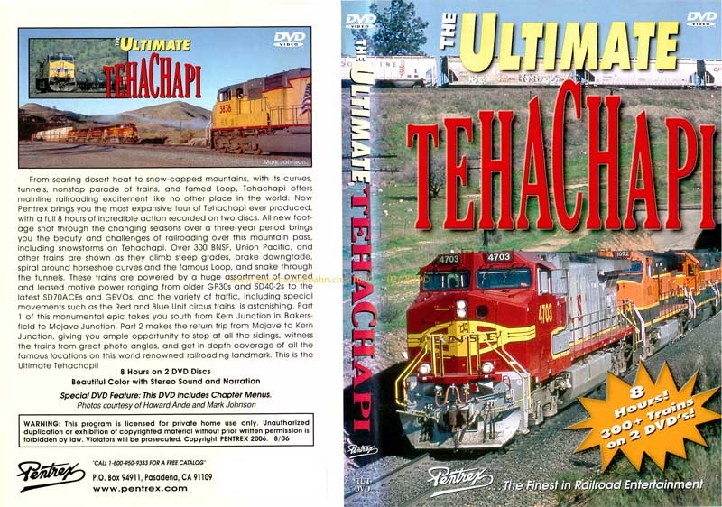 From searing desert heat to snow-capped mountains, with its curves, tunnels, nonstop parade of trains, and famed Loop, Tehachapi offersmainline railroading excitement like no other place in the world. Now Pentrex brings you the most expansive tour of Tehachapi ever produced, with a full 8 hours of incredible action recorded on two discs. All new footage shot through the changing seasons over a three-year period brings you the beauty and challenges of railroading over this mountain pass, including snowstorms on Tehachapi. Over 300 BNSF , Union Pacific, and other trains are shown as they climb steep grades, brake downgrade, spiral around horseshoe curves and the famous Loop, and snake through the tunnels. These trains are powered by a huge assortment of owned and leased motive power ranging from older GP38s and SD40-2s to the latest SD70ACEs and GEVOs, and the variety of traffic, including special movements such as the Red and Blue Units circus trains, is astonishing. Part 1 of this monumental epic takes you south from Kern Juction in Bakersfield to Mojave Junction. Part 2 makes the return trip from Mojave to Kern Jucnction, giving you ample opportunity to stop at all the sidings, witness the trains from great photo angles, and get in-depth coverage of all the famous locations on this world renowned railroading landmark. This is the Ultimate Tehachapi!
