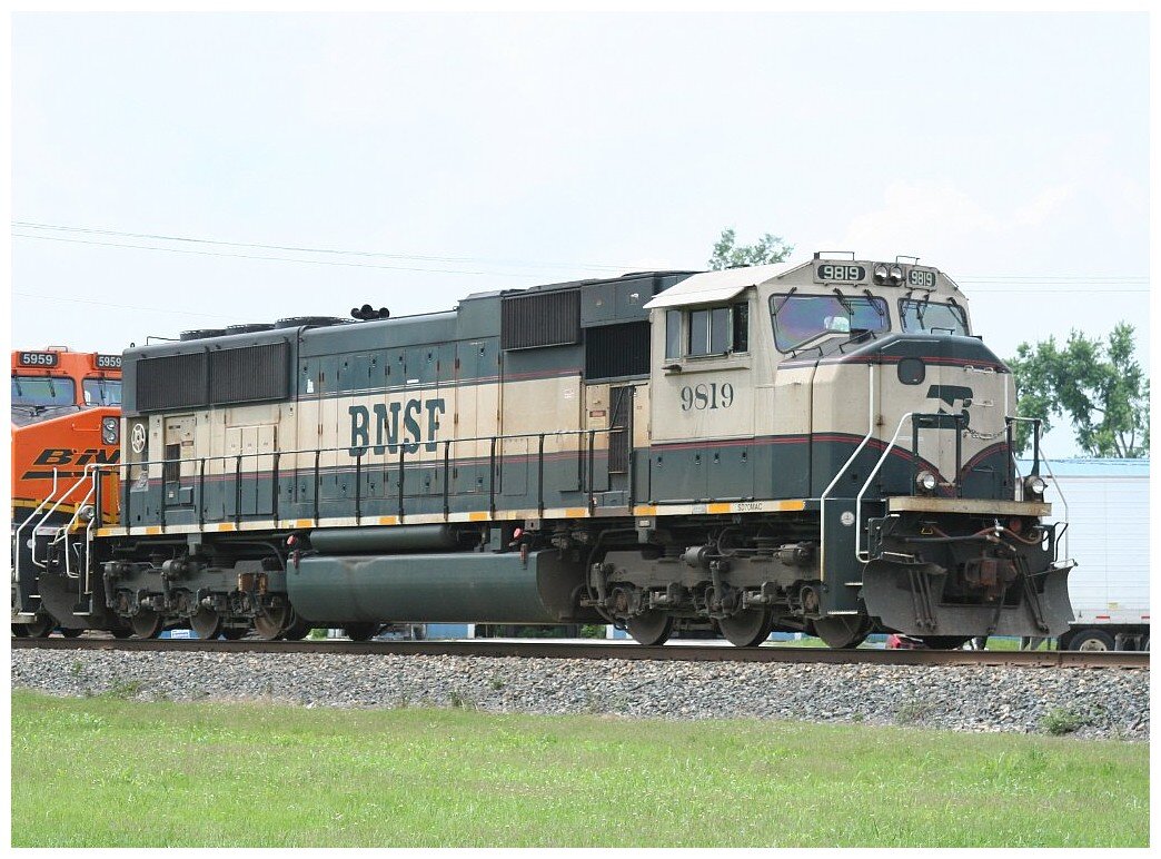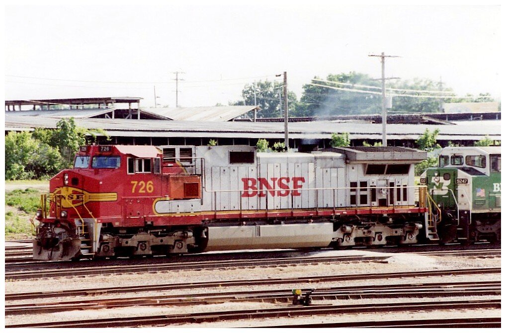 Die erste Lokomotive mit BNSF-Schriftzug war BN SD70MAC Nr. 9647 (Athearn Genesis Modell - Eines meiner beiden Modellen, dieser Lokomotive und Lackierung. Modell zwei ist von Kato USA), die Ende August 1995 vorgestellt wurde, gerade als die Interstate Commerce Commission die Fusion genehmigte. VMV Enterprises in Paducah, Kentucky, lackierte sie in einem einzigartigen Erinnerungsdesign, das die "Warbonnet"-Farbe der Santa Fe mit den "Executive"-Farben der BN in dunklem "Grinstein-Grün" und Creme kombinierte. Von Eisenbahnfans erhielt er den Spitznamen "Kotzhaube". "BNSF" ersetzte "SANTA FE" auf der Front der Einheit, und "Burlington Northern Santa Fe" wurde auf die Seite gemalt. Die Lokomotive wurde inzwischen in die Standardlackierung Heritage III umlackiert.