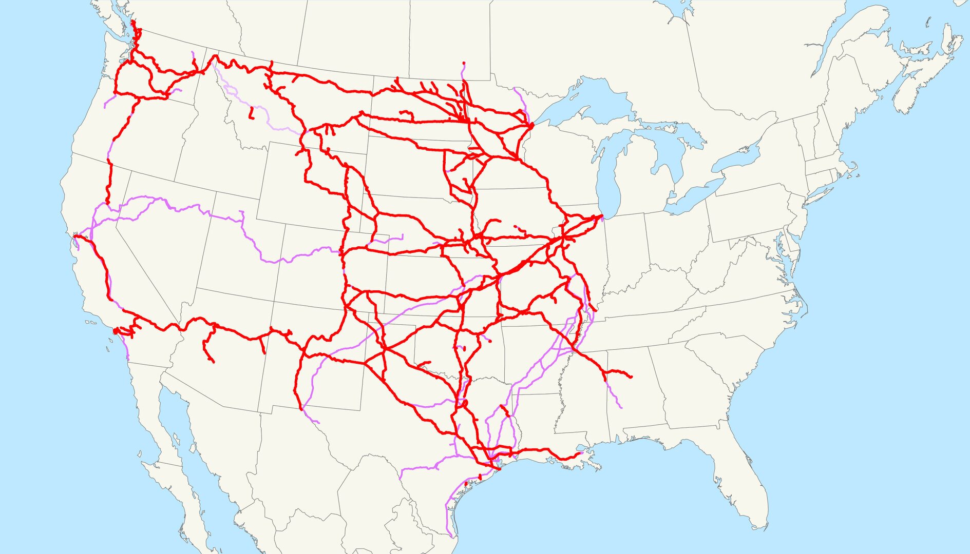 BNSF und ihr Hauptkonkurrent, die Union Pacific Railroad, haben ein Duopol auf alle transkontinentalen Güterbahnstrecken im Westen, Mittleren Westen und Süden der Vereinigten Staaten und teilen sich die Gleisrechte für Tausende von Kilometern.