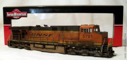 A second-generation Electro-Motive Diesel (EMD) yard-switching engine at Hobson Yard in Lincoln, Nebraska. This is EMD GP28-2 (GP28M) low emissions BNSF H4 1524.GE GEVO ES44AC #5791 BNSF Black swoosh. Modell von Roman Britt - Verwittert von Mel Nipkov. Modell: Intermountain Railway Company DC/DCC w/Tsunamie Sound / Model by Roman Britt - Weathered by Mel Nipkov. Model: Intermountain Railway Company DC/DCC w/Tsunamie Sound