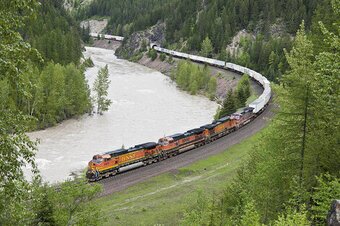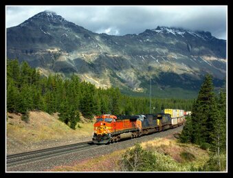 STEVE BROWN: BNSF on Marias Pass, Montana - A westbound BNSF freight, with two CSX units trailing, crests Marias Pass along the south border of Montana's Glacier National Park. Summit Mountain looms beyond in this photo taken in September, 2005.