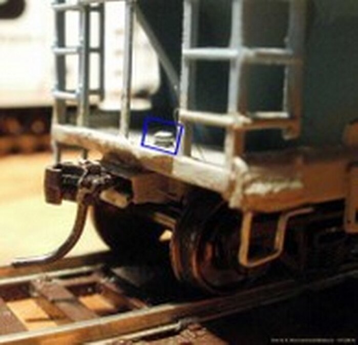 Reparierten Front oder Heck Schaden. Der Sichbare Teil der Schraube, welche den Schachtdeckel und die Kadee #158 halten. Wird noch verdeckt durch ein Anbauteil oder Luftkessel (Blaues Quadrat).