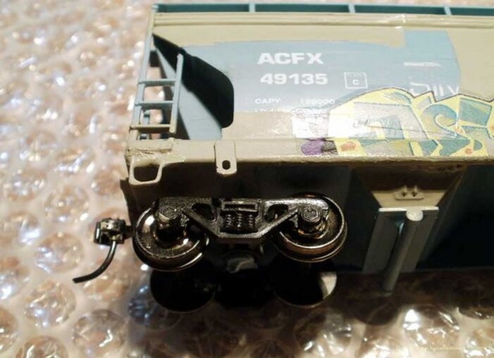 Eine Kadee #5 wurde in den Kupplungsschacht mit Sekundenkleber Bombenfest eingeklebt dies machte sich durch weisse Verfärbung bemerkbar. Eine Wagen Seite hat ebenfalls solche Spuren. Darum sieht man HIER nur eine Seite.