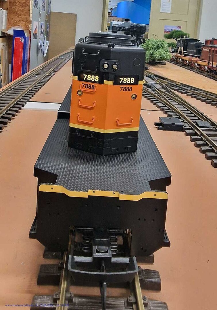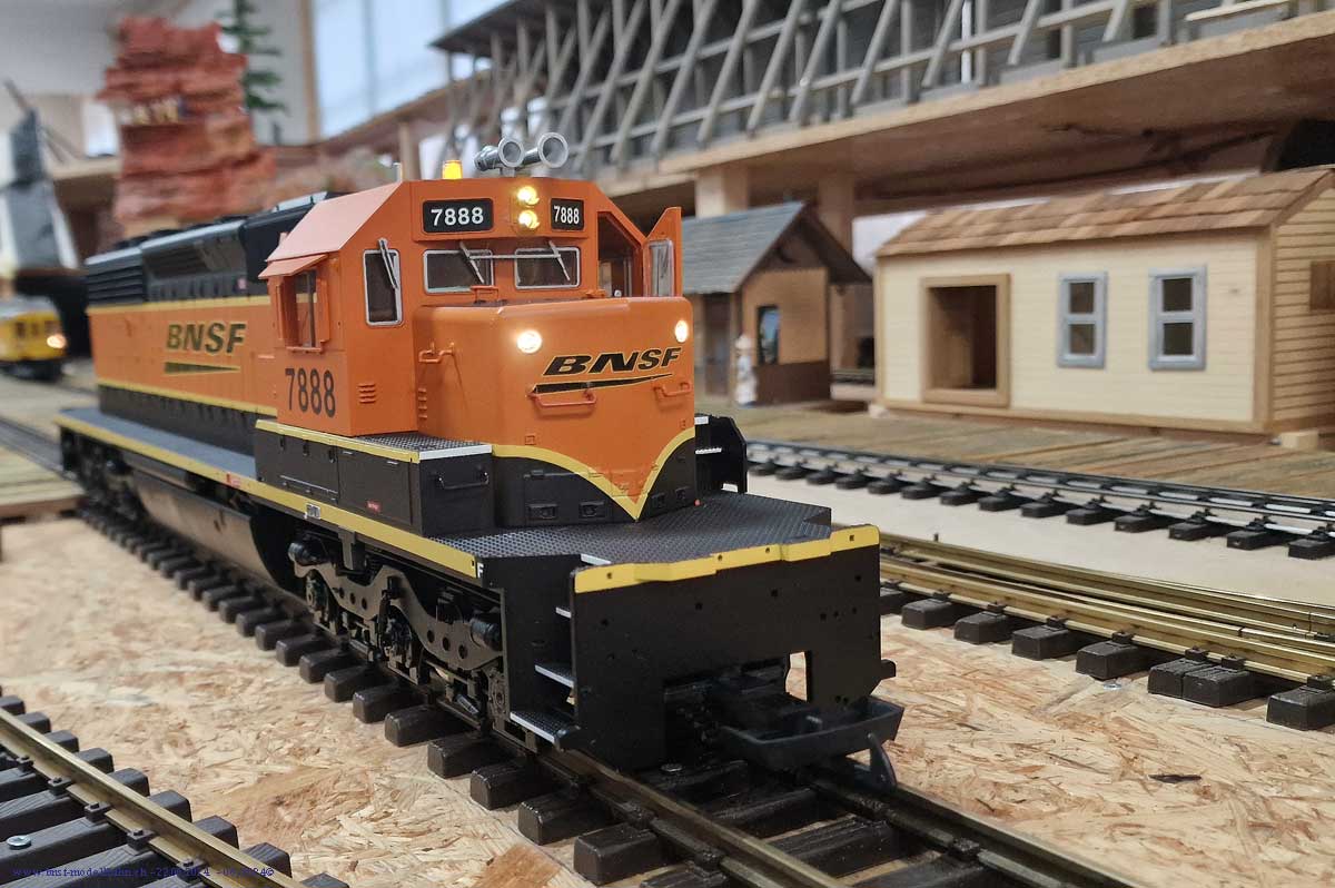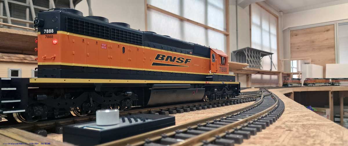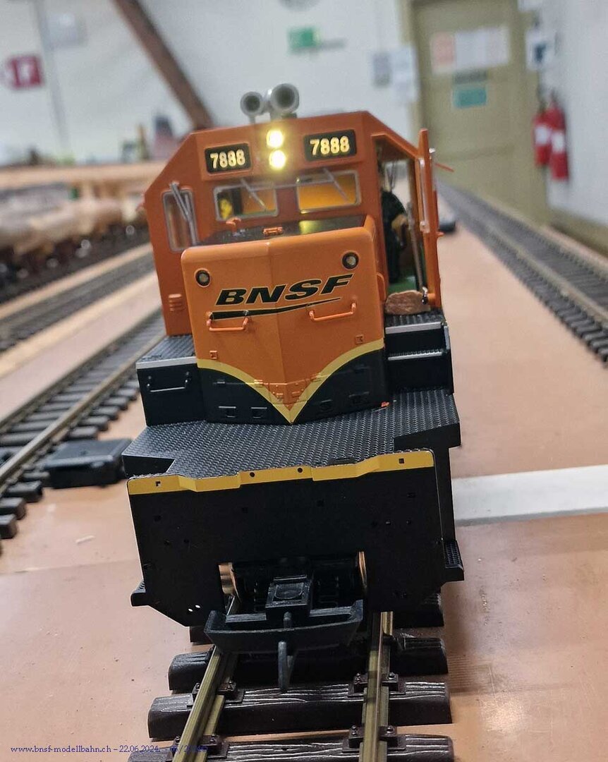 22.06.2024 | BNSF Division | Gartenbahn Indoor Fahren -- SD40-2 & ABe 4/4 - Version 2Gartenbahn Spur G (1:29 & 1:22,5) Fahren. Dies auf der Indoor Anlage von den US G-Scale Friends Switzerland (https://us-g-scale.ch/).Da habe ich meine SD40-2 von USA Trains mit Umbau auf ZIMO MX699LSE Sounddecoder ausgibig in Ruhe Testen und Fahren lassen können. Sie kann Radien von R3 ohne Probleme befahren. Alles was darunter ist. Hat sie mühe und Probleme. An der SD40-2 werden noch die beiliegenden Parts montiert. Sowie sie auf Kadee Kupplungen umgerüstet wird. Ebenso hat André Wetli seine ABe 4/4 von LGB aus gibig fahren lassen. INT: 2024 06 23 SD40 2 & ABe44
