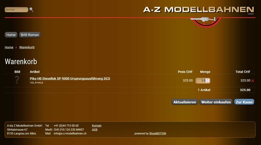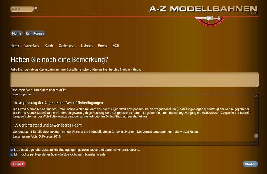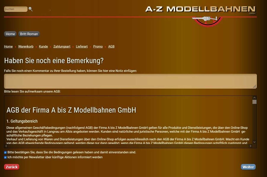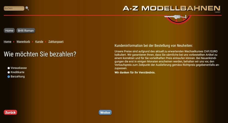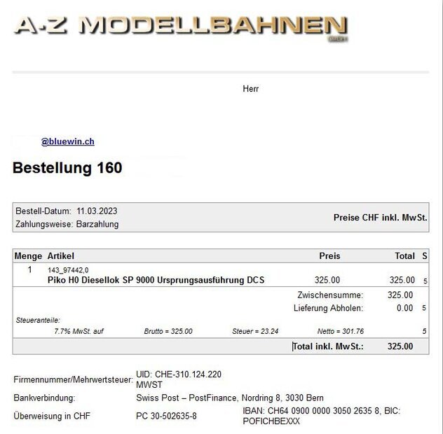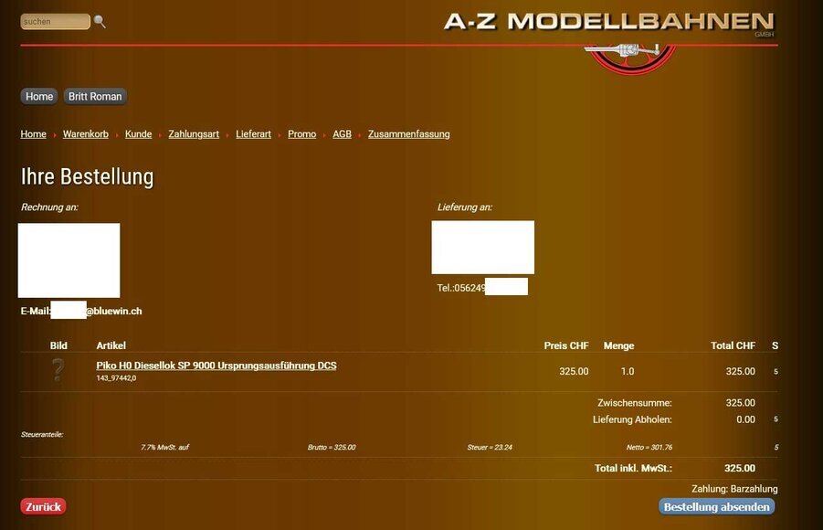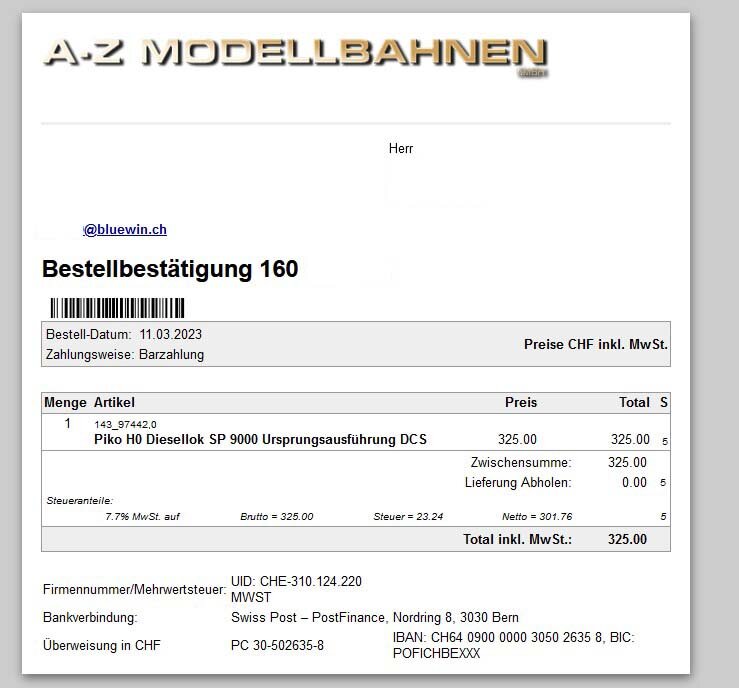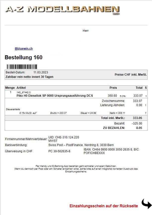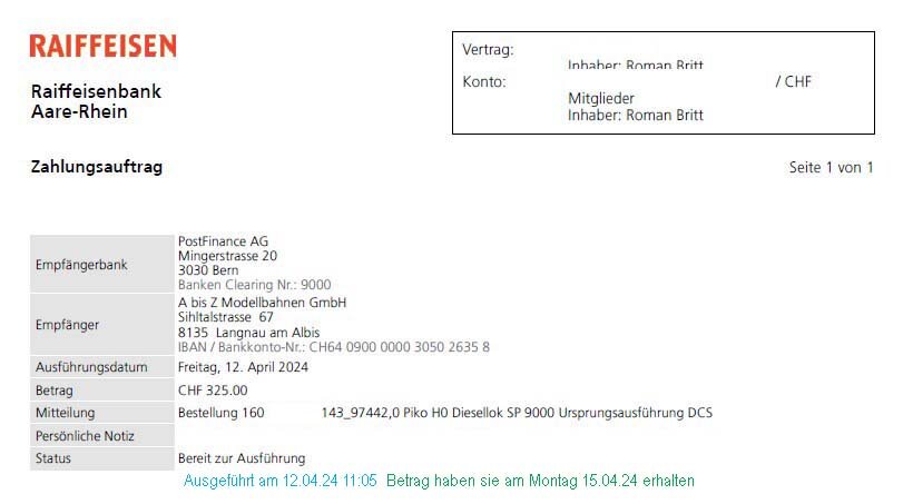 Eine Bestätigung bezüglich Geld Eingang gab es von A bis z Modellbahnen GmbH nicht!